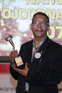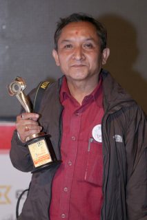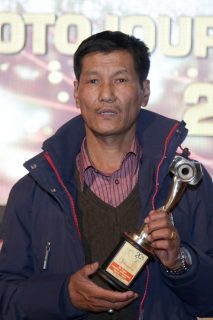 अवार्ड लिदै फोटोपत्रकार लक्ष्मीप्रसाद नाखुसी  । फोटो: एनएफपीजे